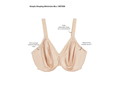 Wacoal's Simple Shaping Full Coverage Underwire Minimizer Bra offers great fit, comfort, and quality and is priced just right for the value conscience gal. This seamless minimizer is completely tailored and will work perfectly under tee shirts and sweaters. A must-have solution style, this unlined minimizer bra reduces your bustline up to one inch, so your clothes fit even better.