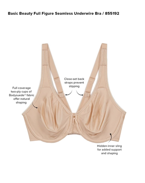 Wacoal's Basic Beauty Full Figure, Seamless Underwire Bra is the bra you will want to slip when you want ultra comfort and natural shaping. Add to that - support that will make all your fashion look terrific. V-back design helps prevent straps from slipping down your shoulders. You will absolutely love this full coverage underwire bra!