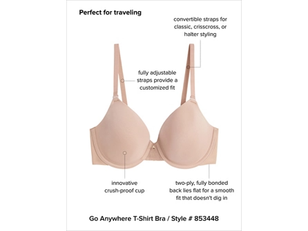 Crafted with unique crush-proof foam cups, this space-saving bra folds into the tightest areas of your suitcase and pops back into shape as soon as you unpack. The convertible design offers multiple styling options to fit any outfit.